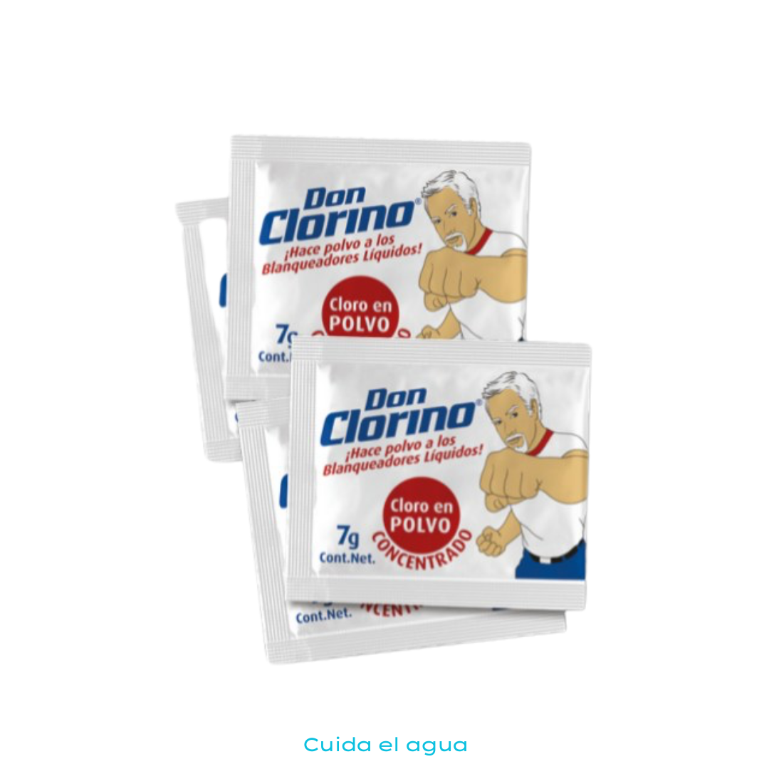 Don Clorino es un innovador blanqueador en polvo formulado con un 51% de cloro activo que por su alto rendimiento es ideal para eliminar manchas de la ropa blanca, Su presentación práctica, de un solo uso, permite lograr un blanqueado profundo y una desinfección eficaz sin dañar los tejidos, al mismo tiempo que reduce el impacto ambiental gracias a su empaque ecológico y su larga vida de anaquel.