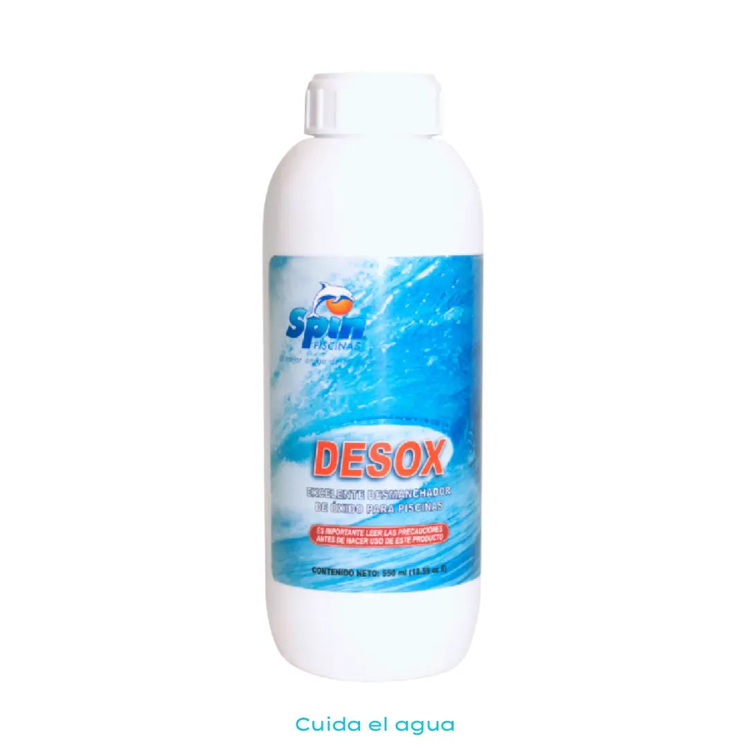 DESOX es un producto químico líquido concentrado diseñado para eliminar manchas de óxido que se forman en el piso, paredes y partes metálicas de piscinas y spa. Su fórmula de rápida acción permite remover la oxidación sin procesos complicados.